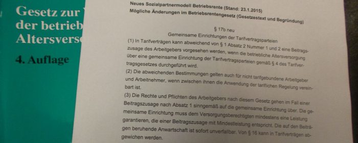 Das Bundesministerium für Arbeit und Soziales hat einen Entwurf Sozialpartnermodell Betriebsrente erarbeitet. Er ist in einem neuen § 17b im Betriebsrentengesetz (BetrAVG) verankert. Veröffentlichungsstand von Gesetzestext und Begründung ist der 23.1.2015. Hiervon ausgehend wurden Gutachten in Auftrag gegeben.