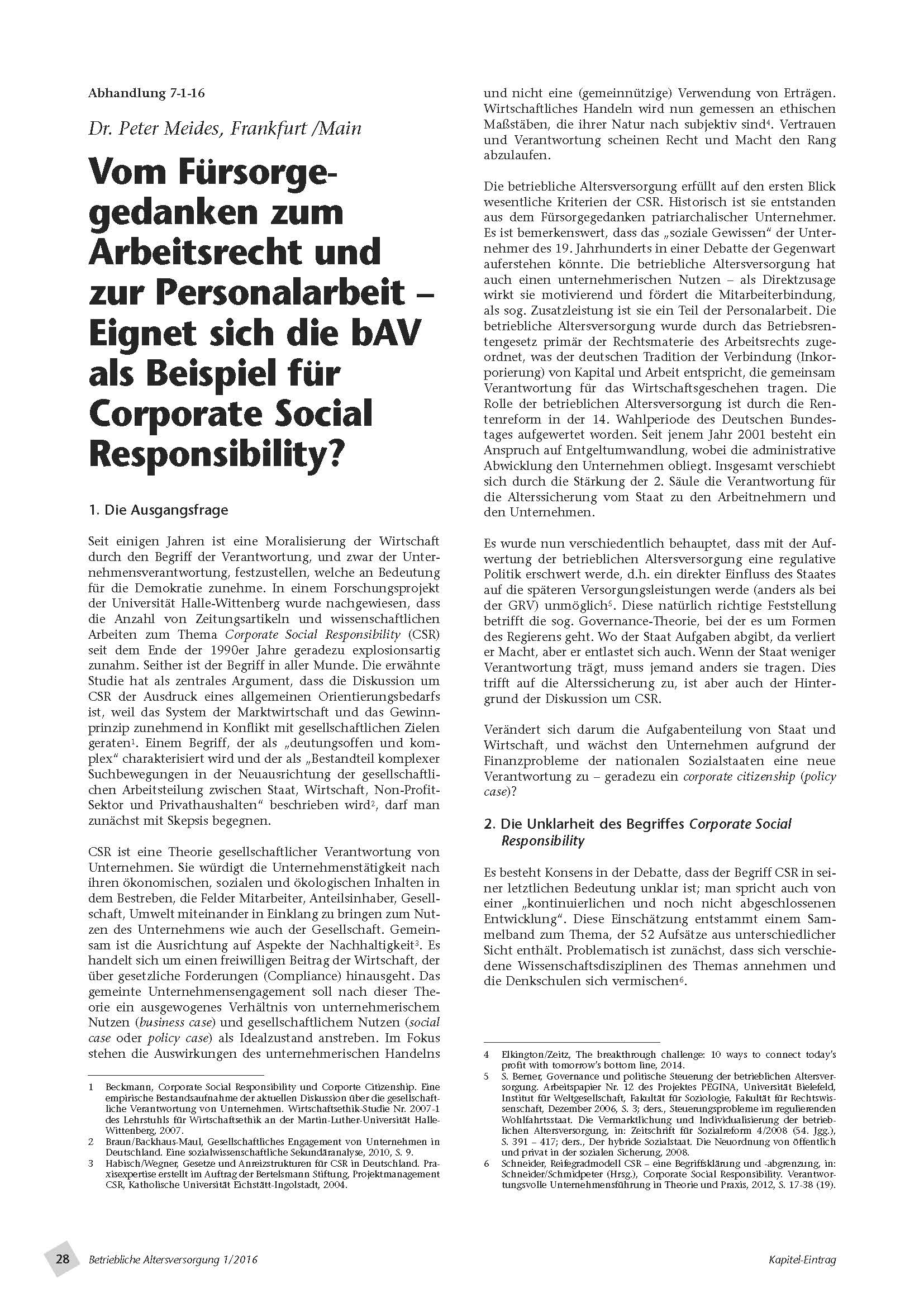 Vom Fürsorgegedanken zum Arbeitsrecht und zur Personalarbeit – Eignet sich die bAV als Beispiel für Corporate Social Responsibility? aba, BetrAV 01/2016, Seite 30-34.
